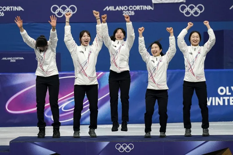 Peraih medali emas Sukhee Shim, Noh Do-hee, Soyeon Lee, Gilli Kim dan Minjeong Choi dari Tim Korea naik ke podium saat upacara penyerahan medali setelah last rate skating lintasan pendek putri estafet 3 000 meter di Milano Figure Skating Arena di Milan, Italia, pada Rabu, 18 Februari 2026 Italia meraih perak dan Kanada meraih perunggu. Foto oleh Richard Ellis/UPI