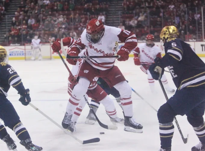 Simon Tassy dari Wisconsin mengontrol puck saat dia bersiap untuk melakukan pukulan melawan Notre Dame di Kohl Center di Madison, Wis. pada hari Jumat 6 Februari 2026.