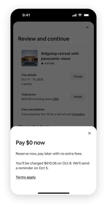 Perusahaan meluncurkan fitur tersebut di AS tahun lalu untuk perjalanan domestik. Airbnb mengatakan bahwa properti dengan kebijakan pembatalan “fleksibel” atau “sedang” memenuhi syarat untuk reservasi di muka. Dengan opsi ini, pengguna akan dikenakan biaya mendekati tanggal check-in, bukan pada saat pemesanan. Fitur ini mencerminkan rencana pembayaran “beli sekarang, bayar nanti” yang telah menjadi populer di ecommerce, menjadikan perjalanan mahal lebih mudah diakses dengan membagi biaya. Perusahaan mencatat bahwa sejak peluncurannya, fitur tersebut mengalami 70 % adopsi untuk pemesanan yang memenuhi syarat.