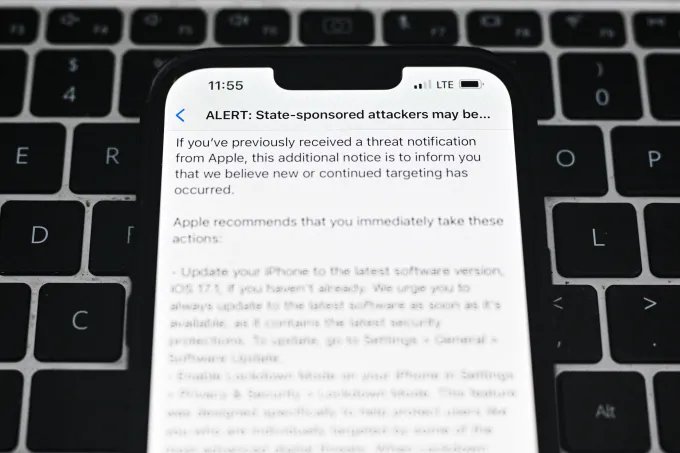 Foto yang menunjukkan teks pemberitahuan ancaman yang dikirim oleh Apple kepada tersangka korban spyware (Gambar: Omar Marques/Getty Images)
