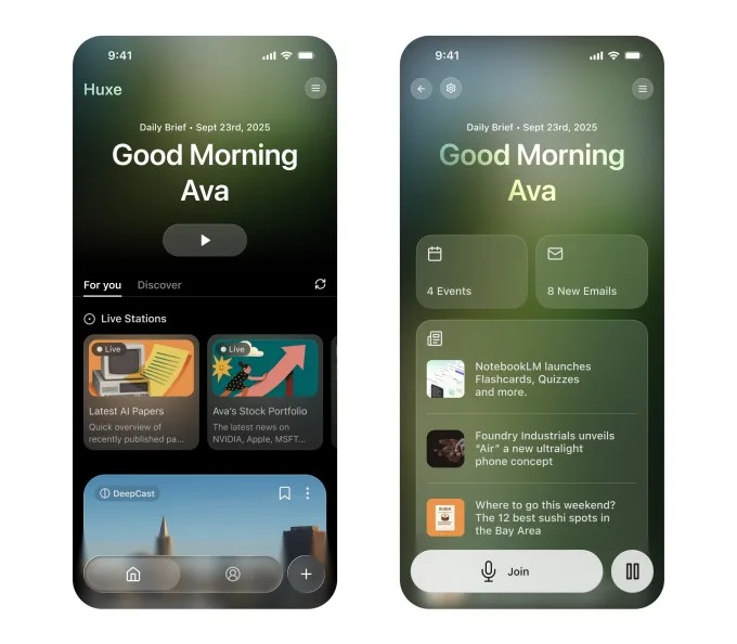 Sepasang tangkapan layar yang menunjukkan layar beranda Audio Huxe di mana Anda dapat melalui ringkasan berita yang berbeda dan podcast DeepDive yang dihasilkan oleh AI.