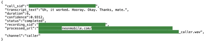 Setelah melakukan beberapa panggilan telepon tes, aplikasi menunjukkan kepada kami daftar panggilan terbaru kami dan berapa banyak uang yang dihasilkan setiap panggilan. Tetapi alat analisis jaringan kami mengungkapkan detail yang tidak terlihat oleh pengguna reguler di aplikasi neon. Rincian ini termasuk transkrip berbasis teks dari panggilan dan alamat web ke file audio, yang dapat diakses oleh siapa pun secara publik selama mereka memiliki tautan.