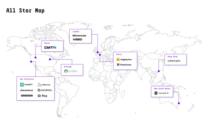 Dan untuk kelima kalinya, 14 perusahaan muncul dalam daftar produk AI top: chatgpt, kebingungan, poe, karakter AI, midjourney, Leonardo, Veed, cutout, sebelas laboratorium, photoroom, gamma, quillbot, civitai, dan huggingface.