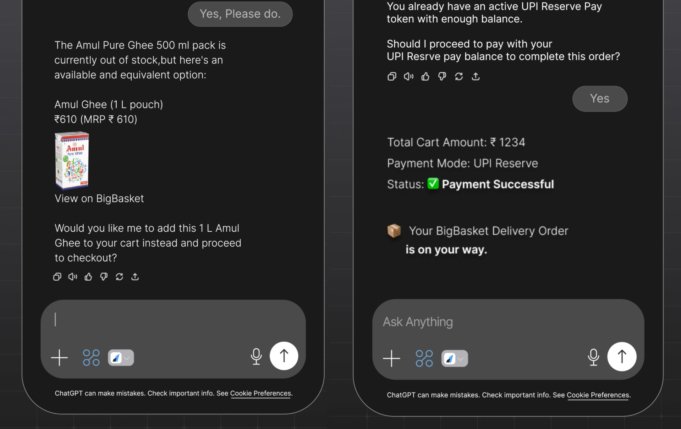 Pengalaman itu dibangun Pembayaran Cadangan UPI — protokol NPCI baru yang memungkinkan pengguna memblokir sejumlah dana tertentu untuk didebit di masa mendatang ke pedagang yang ditunjuk — dan Lingkaran UPIsolusi yang mendelegasikan autentikasi UPI, memungkinkan pembayaran diselesaikan langsung dalam ChatGPT tanpa beralih ke aplikasi atau situs web eksternal. Razorpay telah mengembangkan lapisan integrasi pedagang yang memungkinkan bisnis bertransaksi melalui chatbot AI.