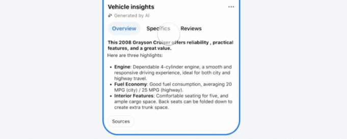 Dan karena ini adalah tahun 2025 dan AI ada di hampir semua bagian Facebook, perusahaan ini juga menambahkan “AI Insights” ke dalam daftarnya. Ini akan memungkinkan Meta AI untuk menawarkan saran pertanyaan untuk ditanyakan kepada penjual tentang item yang mereka daftarkan. (Namun yang penting, sepertinya saran pesan pertama default masih merupakan variasi dari “apakah ini masih tersedia”, yang menurut saya merupakan salah satu kebiasaan yang paling menjengkelkan dalam menggunakan Marketplace.) Perusahaan juga bereksperimen dengan “wawasan” khusus kendaraan dari Meta AI karena belanja mobil tampaknya merupakan salah satu kasus penggunaan Marketplace yang paling populer di kalangan dewasa muda.