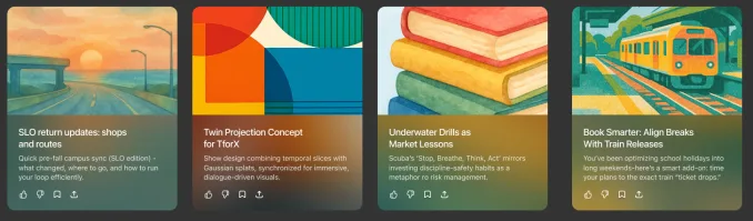 Setiap laporan ditampilkan sebagai “kartu” yang menampilkan gambar dan teks yang dihasilkan AI. Pengguna dapat mengklik masing -masing untuk mendapatkan laporan lengkap dan kemudian dapat meminta chatgpt tentang konten. Pulse akan secara proaktif menghasilkan beberapa laporan, tetapi pengguna juga dapat meminta Pulse untuk laporan otomatis baru atau menawarkan umpan balik pada yang sudah ada.
