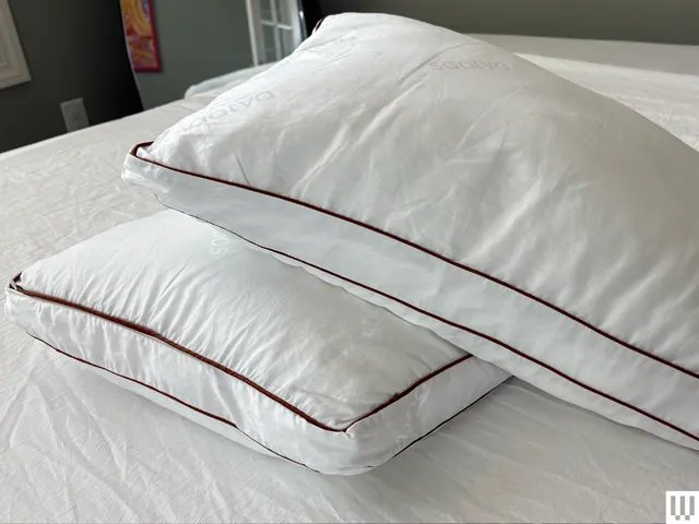 Bantal hotel sepertinya selalu terlalu lembut atau terlalu keras. Bantal lateks Saatva disertakan dengan bundel ini dimaksudkan sebagai jalan tengah yang baik. Menurut saya opsi loteng standar sangat lembek, dan ini bukan hal yang buruk, tetapi Anda harus mengenal diri sendiri sebagai orang yang tidur untuk memutuskan apakah itu yang terbaik untuk Anda. Jika Anda lebih memilih loteng yang lebih tinggi karena Anda tidur miring, memiliki bahu yang lebih lebar, atau ingin mempertahankan keselarasan serviks, tersedia opsi loteng yang lebih tinggi (sekitar 6 hingga 7 inci). Sedangkan untuk loteng standar (4 hingga 5 inci), saya adalah tipe orang yang tidur kombinasi dan menyukai bantal yang lebih datar dan mudah dibentuk yang dapat beradaptasi dengan saya, baik saya tidur miring, tengkurap, atau terlentang.