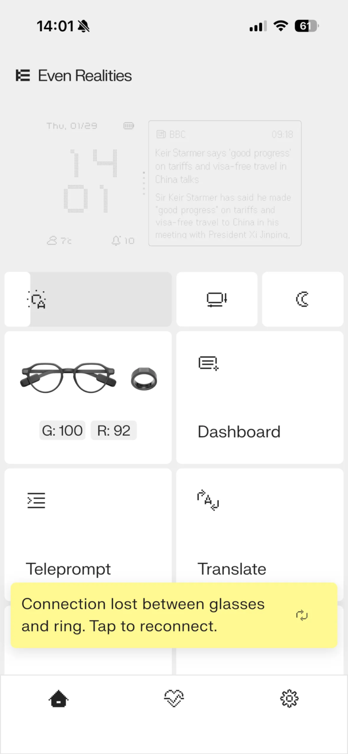 Imbalan dari memiliki kacamata yang “tampak normal” adalah Even G2 sepenuhnya bergantung pada aplikasinya dan koneksi Bluetooth yang stabil. Tersedia untuk iOS dan Android, aplikasi ini, seperti halnya tampilan head-up, adalah urusan monokrom sederhana, dengan mode yang mudah diakses.