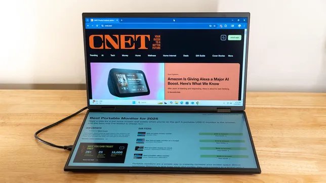 Minisforum MDSA156 adalah monitor portabel dengan bukan hanya satu tapi dua layar. Ini memiliki dua layar 1080p, dihubungkan dengan engsel, yang dapat dilipat seperti laptop. Manfaatnya jelas: Anda mendapatkan banyak ruang layar ekstra yang dapat dimasukkan ke dalam ransel dan dibawa ke mana saja.