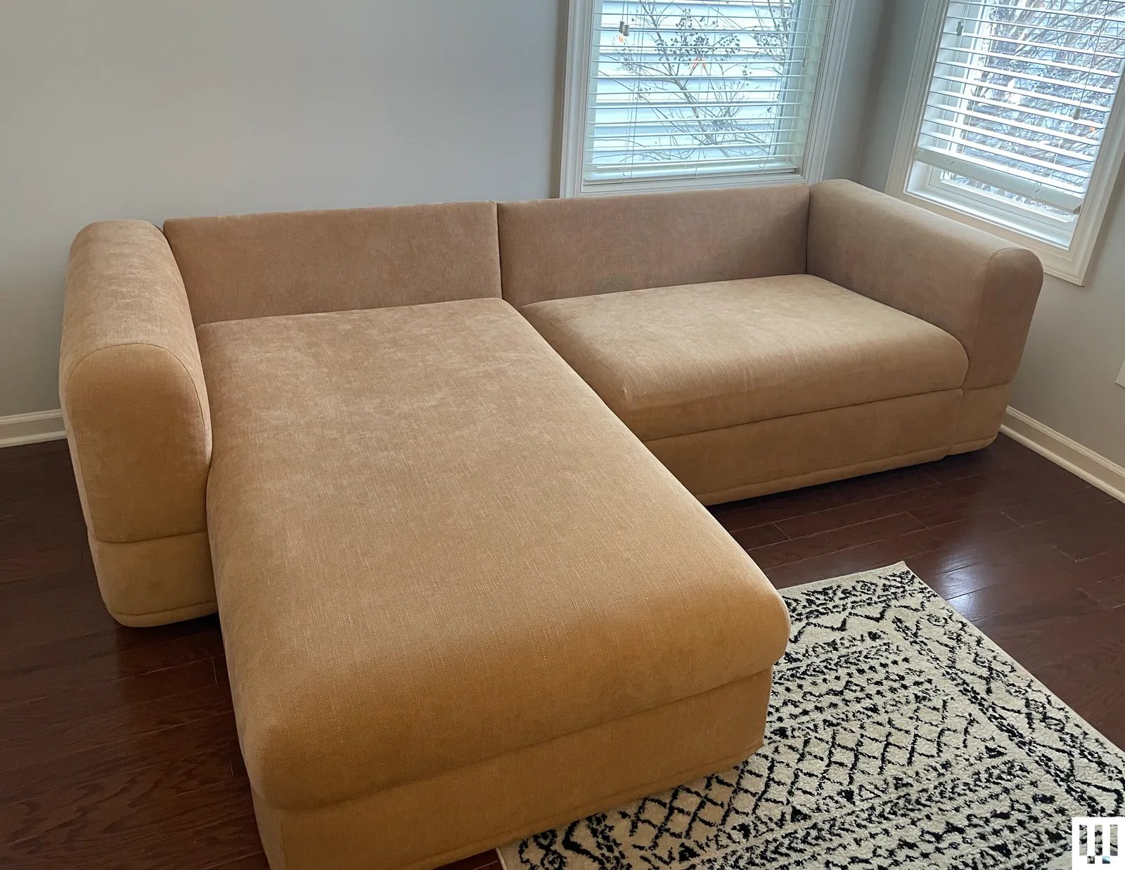 Untuk menghormati semua pengalaman couch tidur saya sebelumnya, saya ingin tahu bagaimana kinerja Wanda di ruangan kecil. Jadi, alih-alih menggunakan studio luas seperti biasa, dengan dimensi 13 kaki kali 15 kaki, saya memutuskan untuk menggunakan kantor rumah saya di lantai atas. Karena saya tidak memindahkan meja saya, Wanda menempati separuh ruangan, yang hanya berukuran 10, 5 kaki kali 10, 5 kaki, kurang lebih, dengan perabotan lain di dalamnya. Tempat tidur sofa memiliki panjang 99 inci (8, 25 kaki) dan menyerupai huruf “L” yang menyamping, dengan kursi malas menonjol keluar 69 inci (5, 75 kaki). Seolah-olah ini belum cukup nyaman, suami saya dan dua anjing kecil memutuskan untuk mendirikan toko bersama saya.