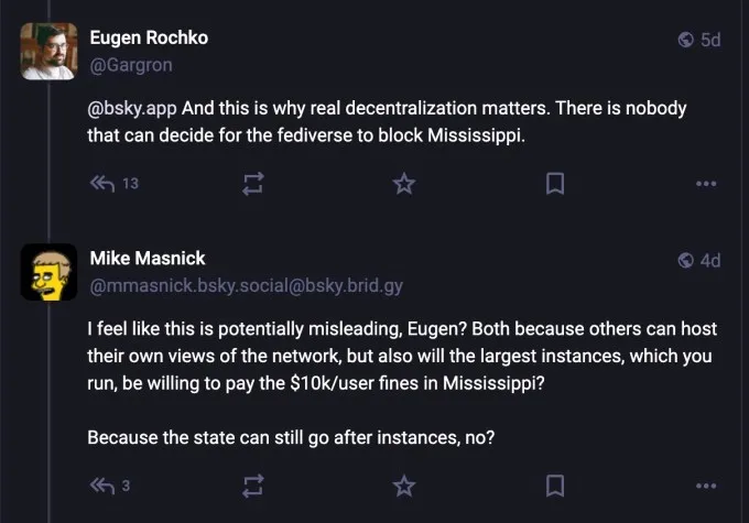 “Dan inilah mengapa desentralisasi nyata penting,” tulisnya. “Tidak ada seorang pun yang bisa memutuskan agar Fediverse memblokir Mississippi.”